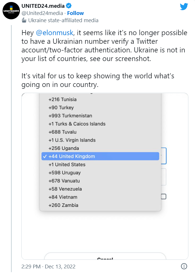 "Привіт, Ілоне Маск. Здається, більше неможливо використовувати український номер для підтвердження номера телефону/двофакторної автентифікації. України немає у вашому списку країн", – йдеться у публікації.