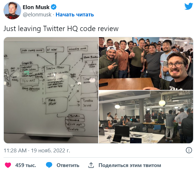 Маск купив компанію 28 жовтня 2022 року — у цей день в кафетерії штаб-квартири Twitter в Сан-Франциско була вечірка з нагоди Хеллоуїна. Співробітники намагалися створити святковий настрій, але все зіпсувало тоді ще чутки, що компанію буцімто очікують масові скорочення: роботу нібито могли втратити до 75% співробітників (їх загальна кількість до того моменту перевищувало 7,5 тисячі осіб).