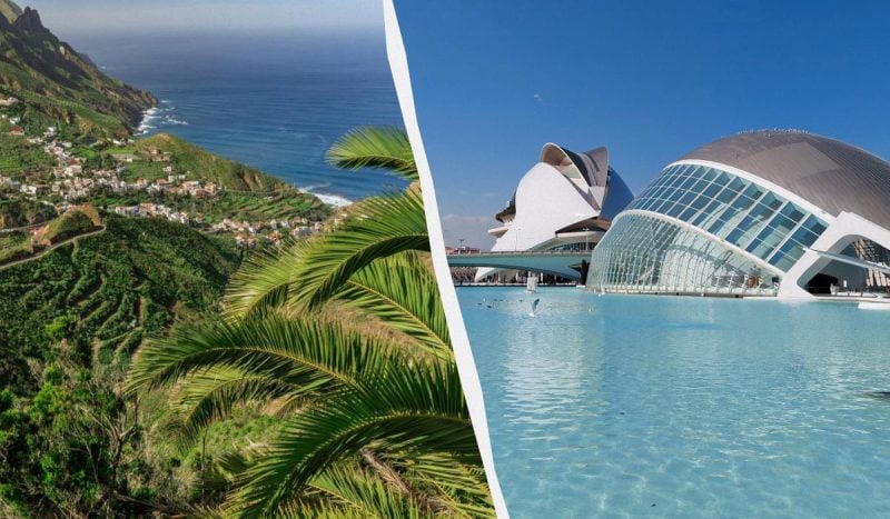 1. Тенерифе. Це найпопулярніший з іспанських Канарських островів. З грудня по лютий сонце тут сяє шість годин на день, а середня температура в ці місяці становить близько 18°C (з максимумом близько 22°C). При цьому острів цілий рік приваблює туристів своїми природними пам'ятками. На Тенерифе розташована найвища вершина Іспанії – діючий вулкан Тейде, що височіє над однойменним національним парком. Піднятися на вершину можна канатною дорогою, але є й безліч пішохідних маршрутів серед червоних скель і пересіченої місцевості.