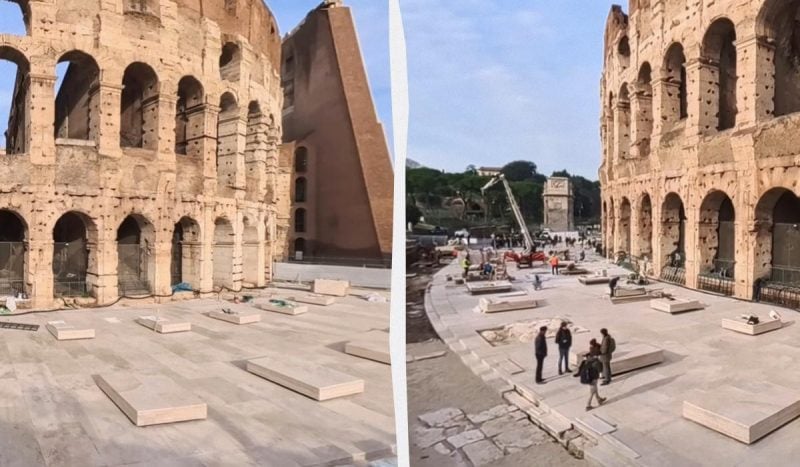 Під час реконструкції Колізею, одного з головних символів Риму, старовинна бруківка за його південною стіною була замінена гладкою білою мармуровою підлогою і лавками з тако ж матеріалу.