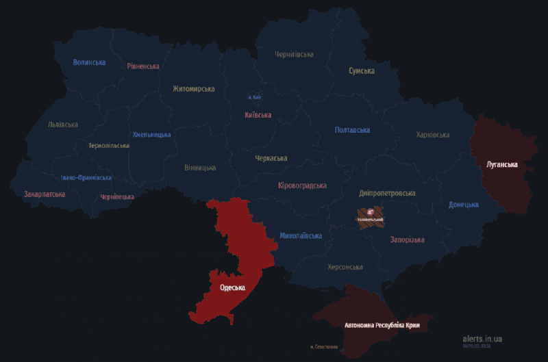 Оновлено о 04:45: Загроза пусків крилатих ракет із російських літаків Ту-95МС, заявили у Повітряних силах. Так зараз виглядає карта тривог.