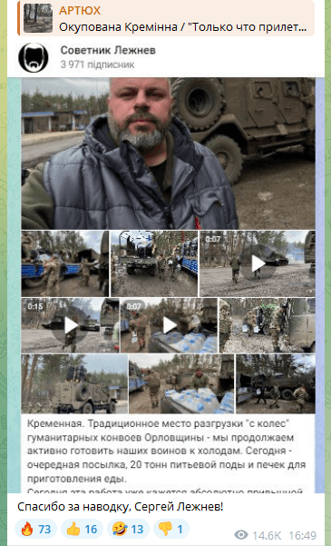 Як пишуть росЗМІ, 14 листопада радник губернатора Орловської області Сергій Лежнєв опублікував у своєму телеграм-каналі фото і відео з розвантаження гуманітарних конвоїв в районі Кремінної. Вже наступного дня він написав у каналі, що потрапив під обстріл ЗСУ та опублікував відео з того ж місця.