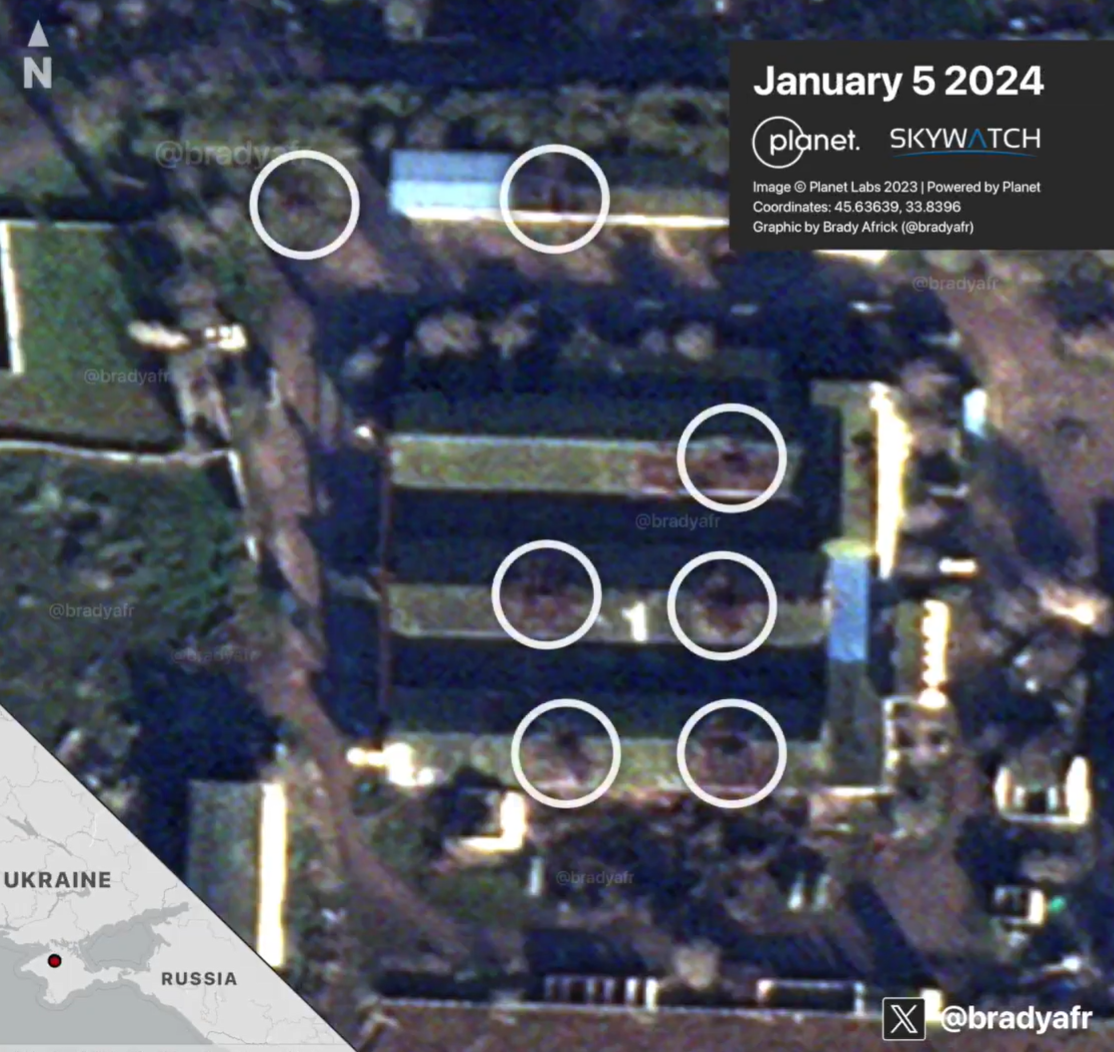 Фото 10 січня опублікував співробітник відділу досліджень зовнішньої та оборонної політики Американського інституту підприємництва (AEI) Бреді Афрік у своєму мікроблозі X (раніше Twitter). Він порівняв знімки від 12 листопада 2023 року зі знімками від 5 січня.