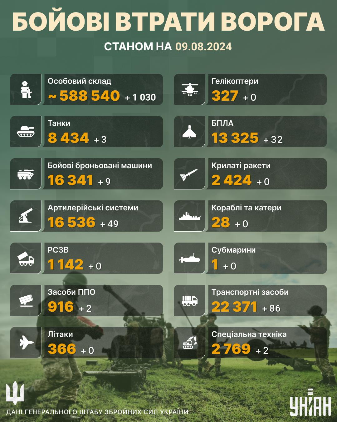 Таким чином, загальні бойові втрати противника з 24 лютого 2022 року по 9 серпня 2024 року орієнтовно склали 588 тисяч 540 осіб.