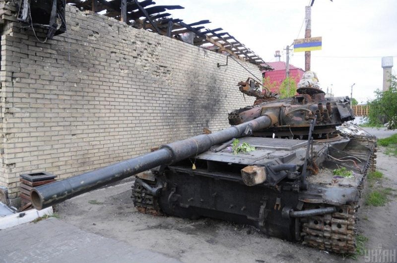 На кадрах видно, що "русскій мір" приніс в селище тільки горе й руйнування. Усюди видно зруйновані будинки, спалені авто та знищену інфраструктуру. Прямо в центрі Гостомеля можна побачити підбитий російськими окупантами під час березневих боїв танк ЗСУ.