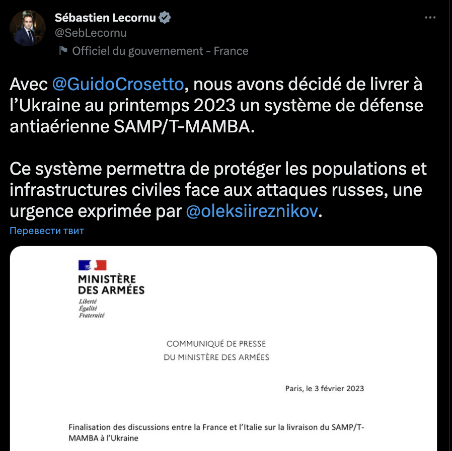 Франція та Італія навесні поставлять системи MAMBA, щоб допомогти Україні захищатися від російських атак з повітря. Про це у Twitter повідомив очільник французького Міноборони Себатьян Лекорню.
