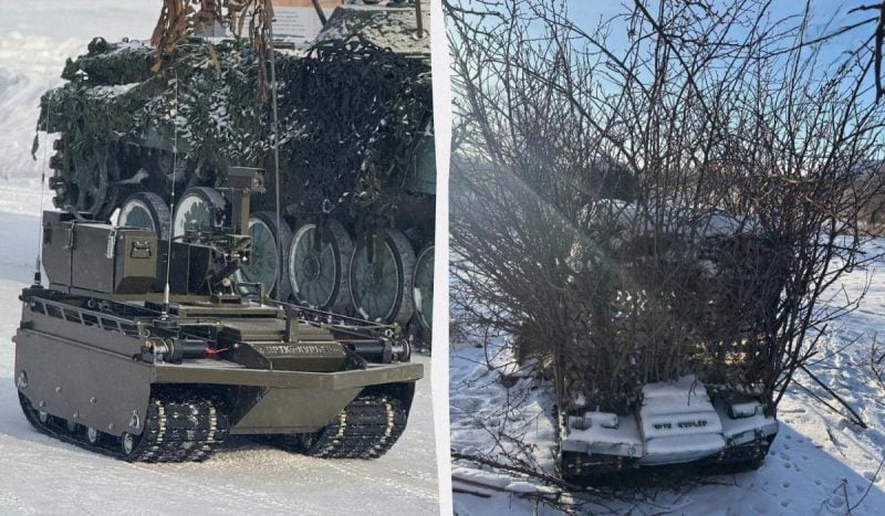 Як пише Defense Express, нещодавно росіяни представили цікаве рішення, як захистити наземні дрони від їх літаючих родичів. Зокрема у Мережі з’явилися фото російського НРК "Курьер" із креативним підходом до маскування. Окрім звичного вже антидронового "мангала" і маскувальної сітки, робота щедро обвішали дрібними гілками. Як результат, вже з невеликої відстані робот виглядає наче звичайний кущ.