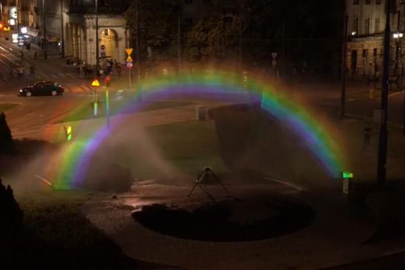 Нова веселка, створена з водяної голограми – підсвічуваних бризк фонтану, засвітилася у діловому районі столиці Польщі.