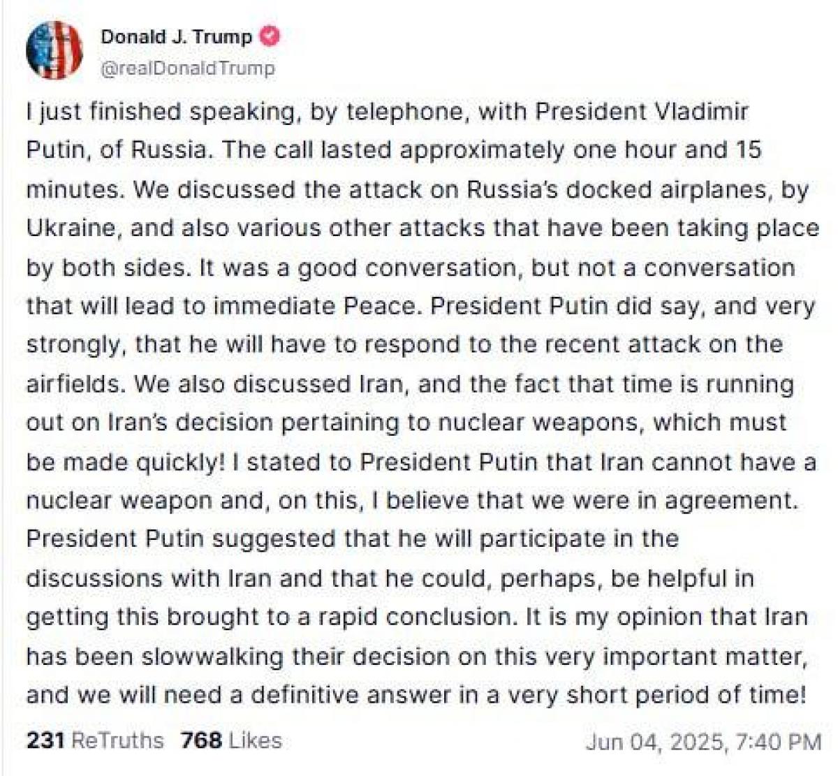 "Я щойно закінчив розмову телефоном із президентом Росії Володимиром Путіним. Розмова тривала приблизно одну годину і 15 хвилин. Ми обговорили напад України на пристиковані літаки Росії, а також різні інші атаки, які відбуваються по обидва боки. Це була хороша розмова, але не та розмова, яка призведе до негайного Миру", - написав він у соцмережі Truth Social.
