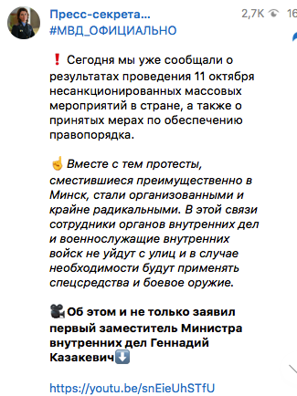 "Протести, що змістилися переважно в Мінськ, стали організованими і вкрай радикальними. У зв'язку з цим, співробітники органів внутрішніх справ і військовослужбовці внутрішніх військ не підуть з вулиць і в разі необхідності будуть застосовувати спецзасоби і бойову зброю. Про це і не тільки заявив перший заступник Міністра внутрішніх справ Геннадій Казакевич", – йдеться в повідомленні.