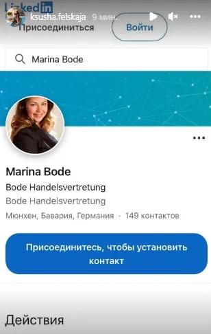 В Linkedin росіянка називає себе Marina Bode. Вона має 149 контактів та зазначає, що перебуває у Мюнхені (Німеччина).